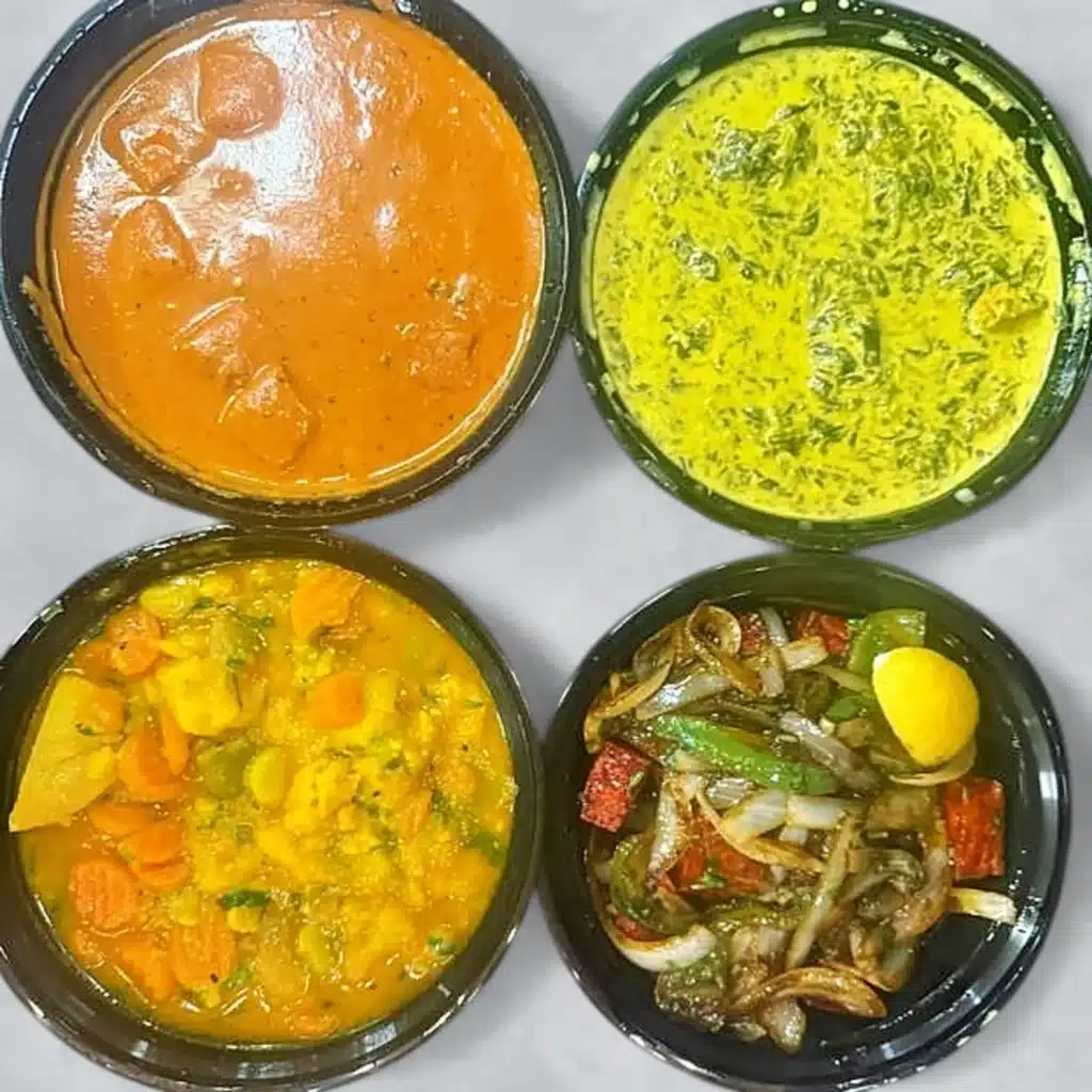 Full order of paneer tikka masala, full order saag paneer, full order mix vegetable curry, full order tofu tandoori, 2 garlic naan, 2 butter naan, Rice pudding, 4 pcs onion pakora, Raita (yogurt cucumber sauce)